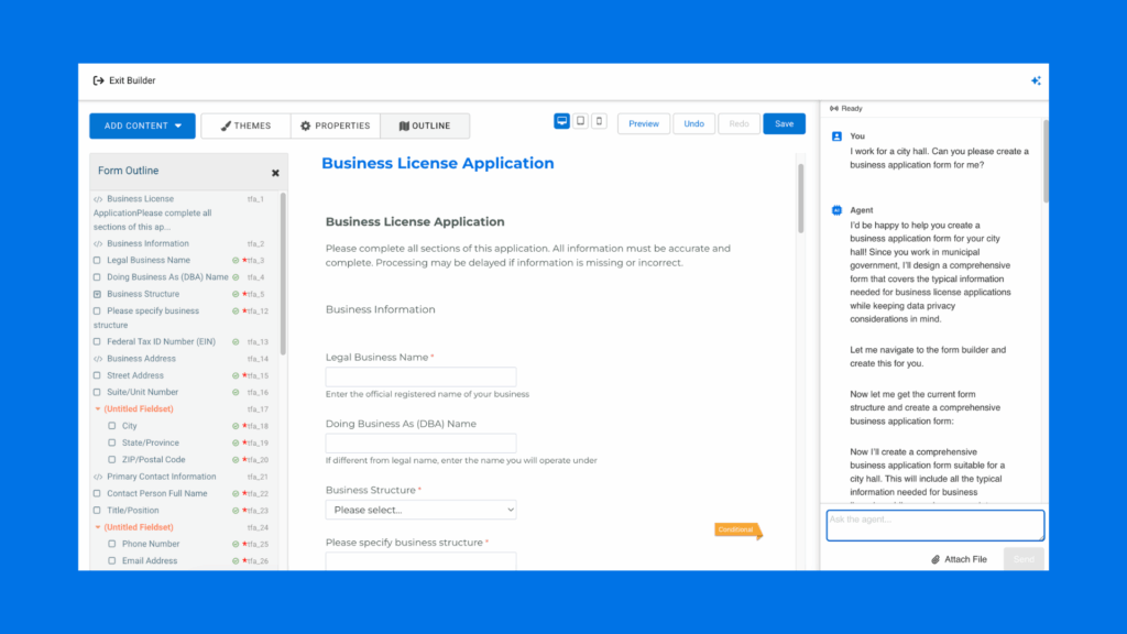 The good news: FormAssembly Atlas can help your team overcome these challenges and work smarter, faster, and more securely. At the center of the platform is Fai, an agentic AI assistant that is able to instantly generate branded forms and workflows, complete with seamless Salesforce integrations. For organizations that aren’t permitted to use AI, Fai can be turned off at the instance level by your administrator or by request by the FormAssembly team.