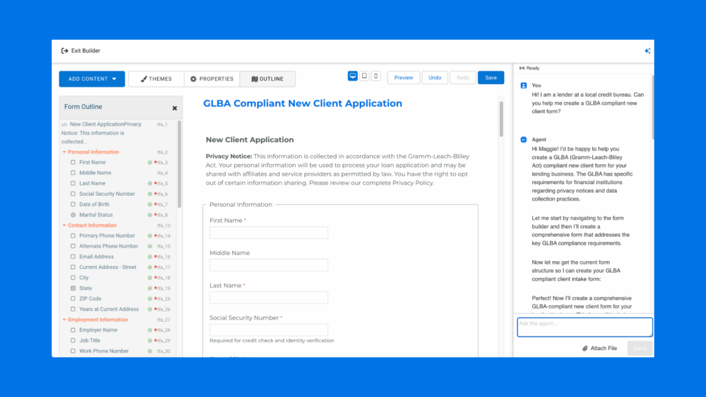FormAssembly’s Solution: FormAssembly provides modern, responsive forms that integrate directly with Salesforce and other CRMs. You can set up multi-step, progressive forms with hidden fields, UTM tracking, and prefilled client information, all while maintaining security and compliance standards like GLBA, and while using Fai to help you do it.