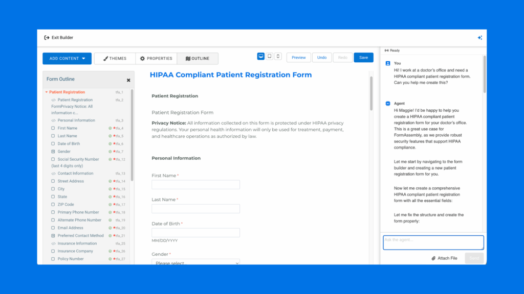 With these safeguards in place, healthcare teams can confidently collect, share, and manage PHI while staying compliant. With Fai, compliance becomes part of your workflows from the start. The agentic AI assistant provides real-time guidance on data privacy and security requirements based on industry and region, helping healthcare organizations configure forms and workflows that align with HIPAA from the get-go.