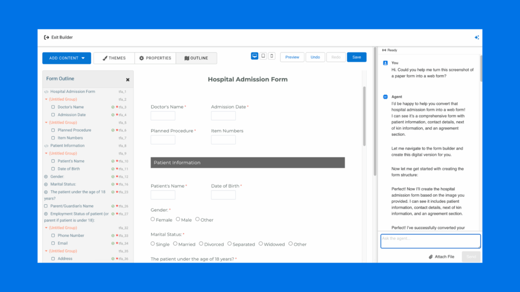 With File to Web Form, Fai makes it easy for healthcare teams to digitize their existing paper and PDF forms – simply upload an image of a paper form or a PDF file, and Fai will transform it into a web form in seconds.