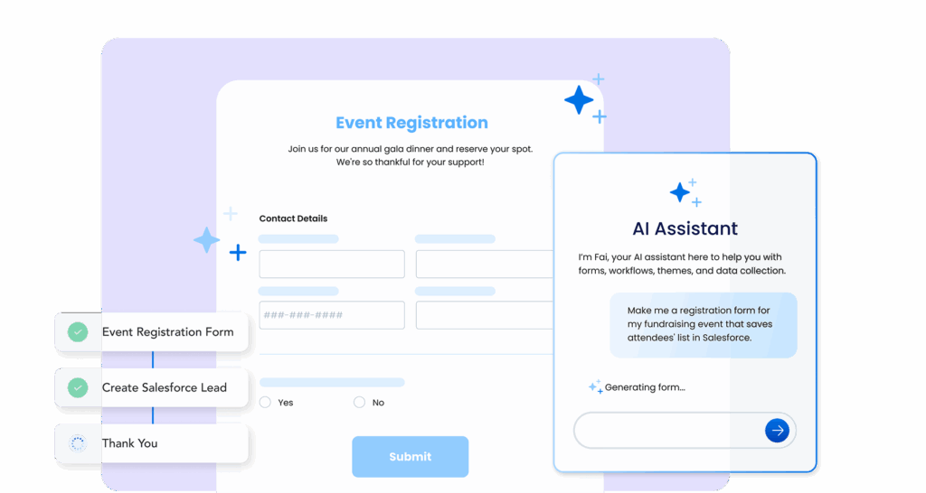 Fai is more than an AI helper – it’s your autonomous assistant, built directly into FormAssembly Atlas. With just a few prompts, Fai designs entire workflows, connects them to your systems, and provides real-time guidance on compliance and optimization while keeping you fully in control at every step.