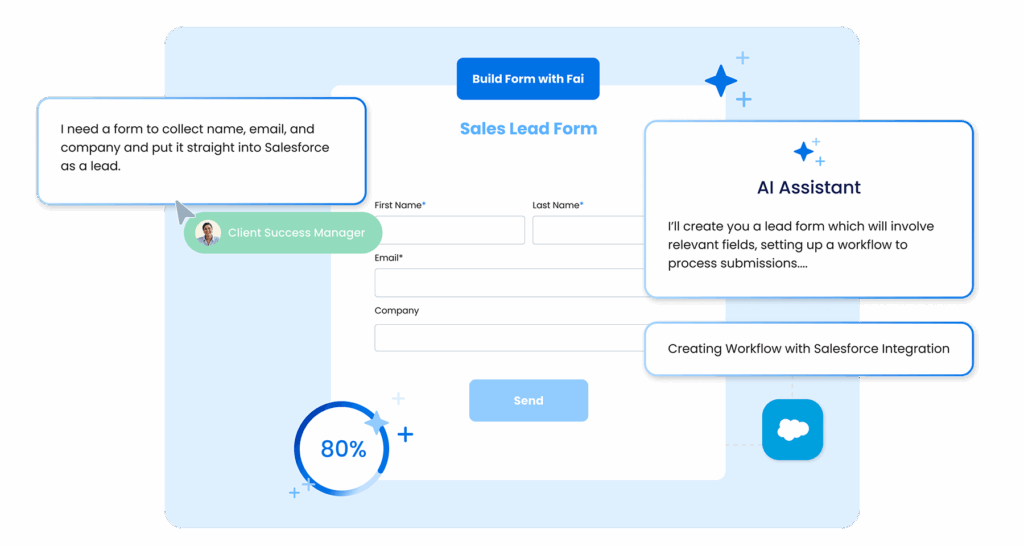 - Accelerate setup: Describe what you need in plain language and Fai instantly builds the forms, workflows, and integrations to match.